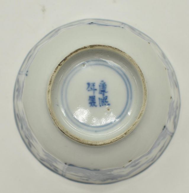 A Qing Dynasty blue and white cup. The cup depicting pots of plants and figurines to exterior. Pots of flowers and scrolling to interior. Four character Kangxi Nian Zhi mark to base. Presented with wooden stand. Measures approx. 6cm tall x 10cm diameter.