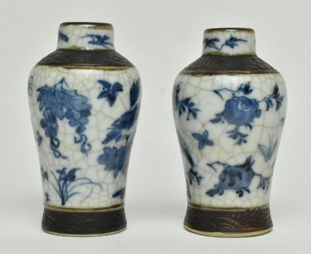 A group of Chinese ceramics, to include a late 19th century crackle famille rose Meiping vase with Ming Chenghua mark to base; a pair of export Nanking blue and white miniature vases decorated with grapes and flowers; a small famille rose seal box decorated with flowers and bird; and a 20th century blue and white crackle ginger jar with cover.  Largest measures approx. 27cm tall.