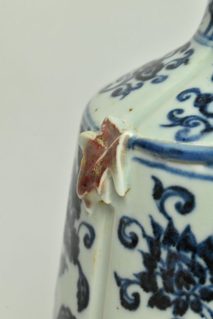 A blue and white with copper-red rouleau vase. The vase painted in underglaze blue with stylized lotus flowers, copper-red vine leaves and scrolling foliage. Four character Yongle Nian Zhi 永乐年制 mark to the shoulder of the vase. Measures approx. 29cm tall.