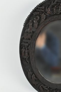A Republic period oval shape wall mirror mounted with mahogany hardwood frame, the frame carved with figurines in Ming dynasty clothes, phoenixes, pine trees and floral scrolling. Measures approx. 36cm tall x 46cm long.