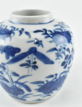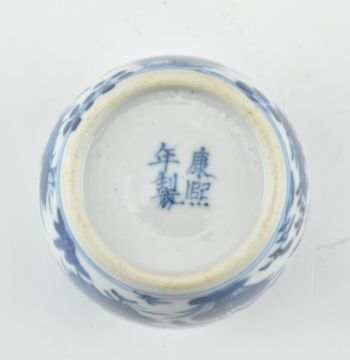 A small blue and white ceramic ginger jar decorated with pomegranate, flowers, butterflies and birds. Featuring Kangzi mark. Measures approx. 8.5cm tall.