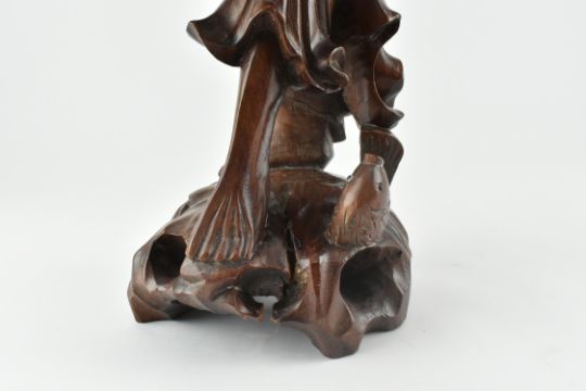A Qing period carved wooden figurine of Jiangziya (姜子牙). The figurine carrying a fishing basket, rod and a fish beside him. Bone inlaid teeth, the eyes of glass with painted pupils. Cracks found on robe and the plinth. Measures approx. 43cm tall excluding rod.