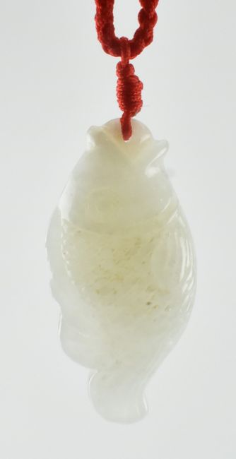 A natural Hetian white jade hand carved pendant in a form of a fish. Presented with red adjustable cotton thread necklace. Measures approx. 5cm long.