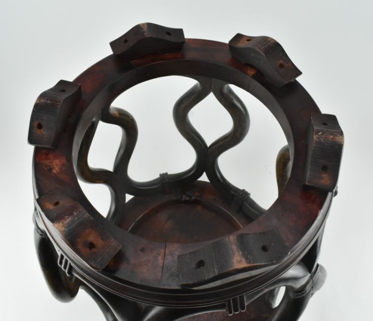 A Qing or later wooden drum stool. The stool has a circular panelled top raised on reticulated hardwood support united by a circular stretcher, raised on five bracket feet. Measures approx. 46cm tall x 36cm diameter.