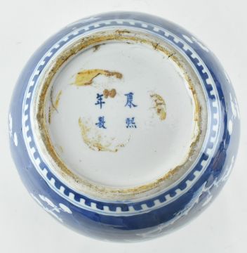 A large Qing dynasty blue and white prunus ginger jar with lid. Four character Kangxi Nian Zhi mark to base. Restoration and damage to the rim. Measures approx. 29cm tall x 25cm.
