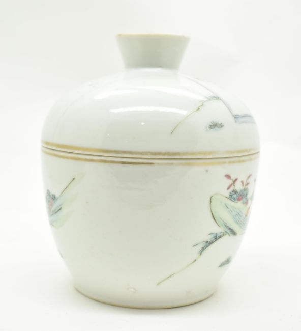 A Qing dynasty famille rose jar with lid. The jar decorated with a scene of a family gathering in the garden and matching lid, lid having been previously repaired. Tongzhi NianZhi mark to the lid and the base. Measures approx. 14cm tall x 13cm diameter.