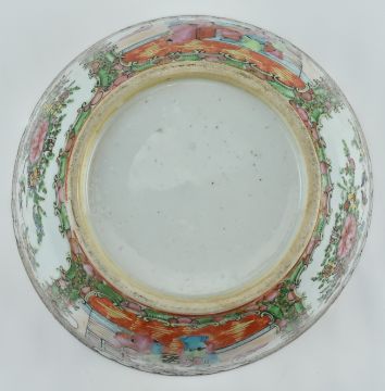 A large Qing dynasty famille rose Canton figurine bowl. Measures approx. 13cm tall, 30cm diameter.