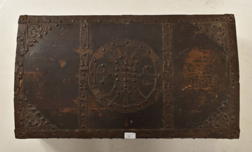 A Qing dynasty hardwood curved chest storage box decorated with Longevity and nailheads. Measures approx. 23cm tall x 78cm long x 45cm wide.