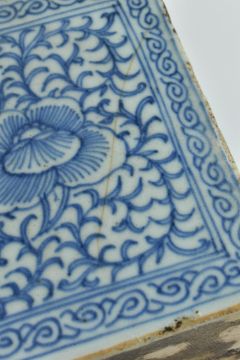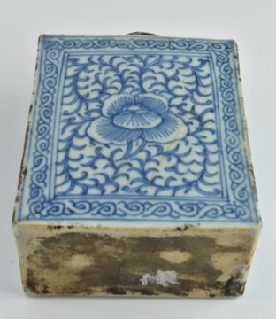 Two Qing dynasty blue and white tea caddies. Each rectangular shape caddy decorated with flower and foliate scrolling. Larger caddy measures approx. 15cm tall.