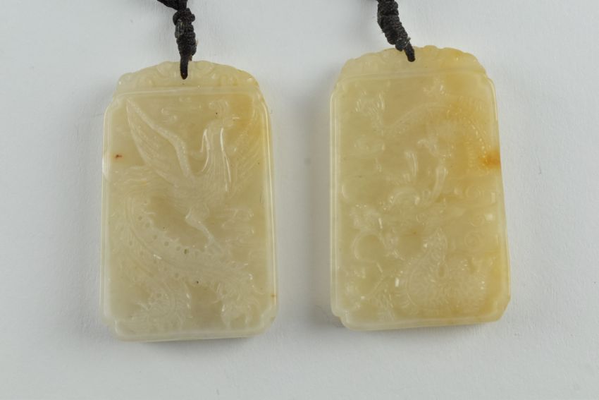 Two Yunnan Huanglong jade carved pendant figure in a dragon and a phoenix. Presented with a red cotton adjustable necklace. Measures approx. 4.5cm tall x 3cm wide.