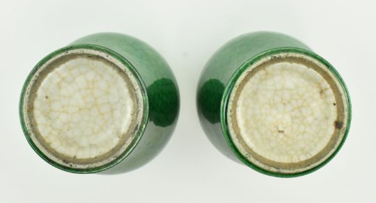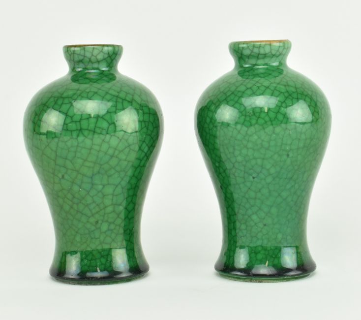 A 20th century apple green glazed crackled brush washer along with a pair of early 20th century apple green glazed crackled vases. Measures approx. 12cm tall. Brusher washer measures approx. 26cm diameter.