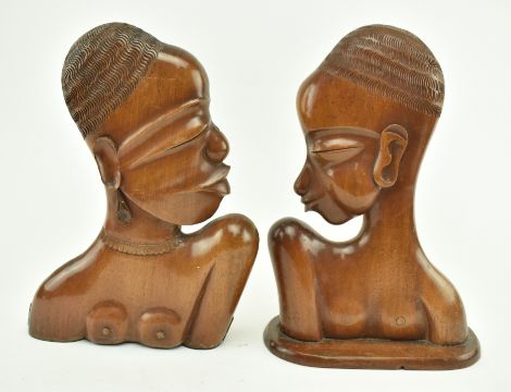 Two 20th century vintage African wooden carving of two busts of ladies. Measures approx. 33cm tall.