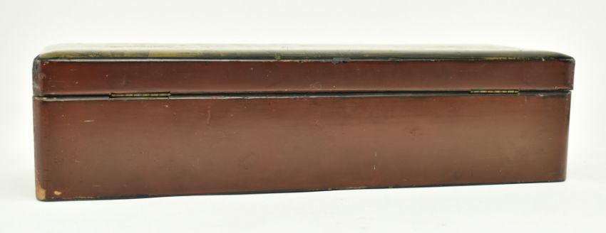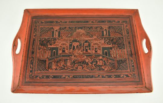 An early 20th century Burmese red lacquered twin handled serving tray, along with a Japanese gilt lacquer lidded box. The Burmese tray featuring scenes of offering & a temple; the lidded box with birds, blossom trees and Mount Fuji in the background. Tray measures approx. 5cm x 47cm x 33cm, the trinket box 7.5cm x 31cm x 11cm.