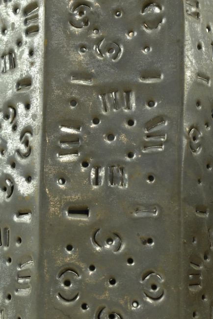 Two vintage mid century circa 1960s Mexican perforated hanging light shades. Each cylindrical shade with pierced geometric design, one complete with chain. Taller of the two measures approx. 15cm in diameter, 35.5cm tall.
