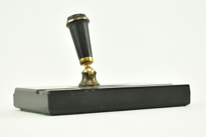 An early 20th century circa 1940s Parker Pen slate desk tidy pen holder. The desktop pen holder featuring holder mounted on brass swivel mechanism, with a faceted slot for nibs and a pen rest. Labelled Parker to side. Mounted on green baize. Measures approx. 11cm tall, 15cm x 9.5cm.