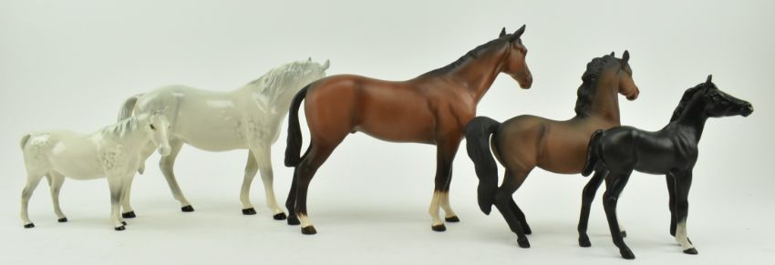 A collection of five 20th century Beswick porcelain and bisque horses. Each horse of varying size, featuring two brown bisque horses, a black bisque horse and two porcelain horses in dappled white, one by Beswick and one by Royal Doulton. All bar the small black horse marked to underside. Tallest measuring approx. 21cm tall, 24cm long.