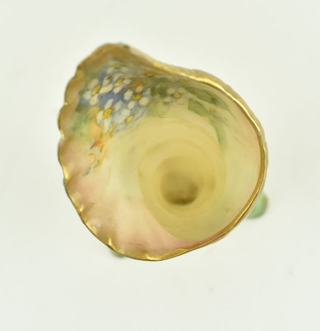 A 19th century Scottish Possil Pottery Nautilus porcelain vase. The vase modelled in a form of a conch standing vertically, supported on stalks of coral. The conch vase decorated with white flowers both exterior and interior. Measures approx. 16cm tall.