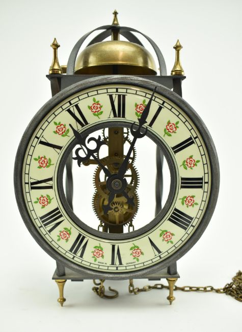 A mid-late 20th century German skeleton clock. The clock with Roman dial to enamel clockface, featuring rose pattern. Complete with chain. Sold as untested. Measures approx. 25cm tall.
