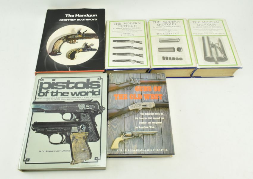 Military, firearm & weaponry interest. A collection of reference books regarding handguns, shotguns and firearms, all in dust wrappers. The lot comprising 1931 The Modern Shotgun by Major Gerald Burrard, DSO RFA in three volumes each complete with original unclipped dust wrappers, first volume with 1941 dedication to ffep, 1970 The Handgun by Geoffrey Boothroyd, 1978 Pistols of the World by Ian V. Hogg and John Weeks and 1961 Guns of the Old West by Charles Edward Chapel. All in smart condition, occasional slight loss to the heads of the spines of the dust wrappers of The Modern Shotgun & the occ. closed tear in places. Six books in lot.