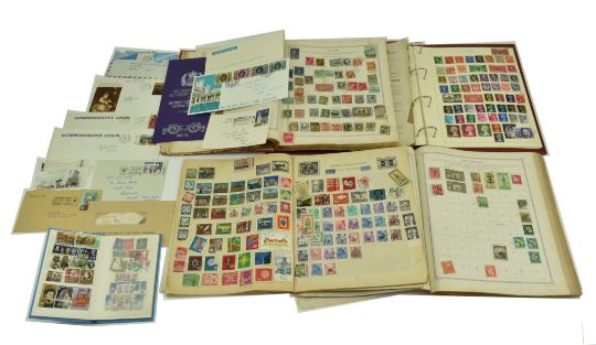 A collection of 19th century and later definitive and commemorative stamps & first day covers, both foreign & GB issues. The lot to include two Penny Reds, both with cancellation marks, and issues from Ireland, Mongolia, India, Palestine, Gold Coast, France, Australia etc. Presented in four albums (one disbound and in poor condition and one being pocket sized), along with a handful of loose FDCs.