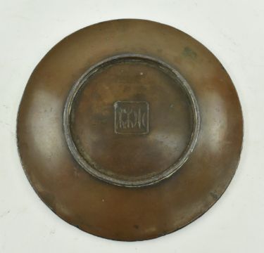 A pair of 19th century Japanese bronze herons and a bronze embossed plate featuring dragon design. Tallest measures approx. 9cm tall.