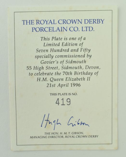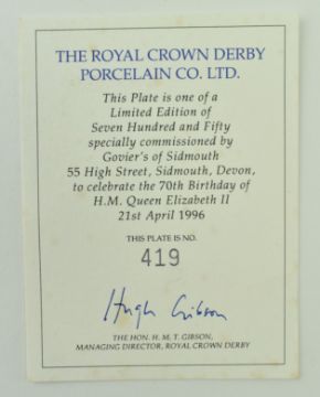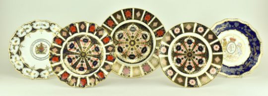 Royal Crown Derby - a collection of five Old Imari pattern china cabinet plates, three boxed. The lot comprising Old Imari 1128 LVII, 1128 XLIX, The Yorkshire Rose Plate lim ed No. 639 of 2000 with certificate and box, 70th Birthday of H.M. Queen Elizabeth II cabinet plate commissioned by Govier's of Sidmouth no. 419 of 750 boxed & with certificate, and a 50th Wedding Anniversary of H.M. Queen Elizabeth II and H.R.H. Prince Philip, no. 335 of 750, boxed and with certificate. Largest measures approx. 23cm in diameter.
