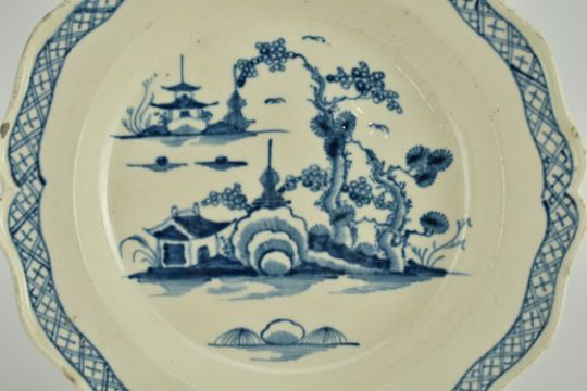 A late 18th century pearl ware blue and white plate. The plate decorated with a scene of landscape with fluted rim. A label with description on the base. Measure approx. 20cm diameter.