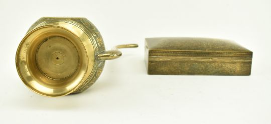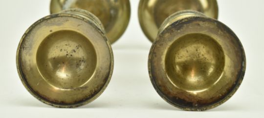 An assortment of Indian early 20th century embossed brass items. The lot to include a pair of decorative flower vases with flared rims all decorated with floral & foliate motifs, a brass embossed trinket box with hand painted peacock motif to centre surrounded by intricately decorated floral patterns, together with a twin handled jug ewer with painted flower motifs throughout. Tallest measures approx. 31cm tall x 13cm in diameter.
