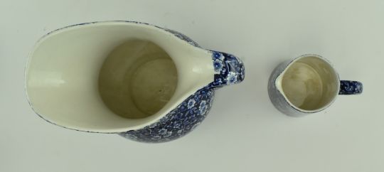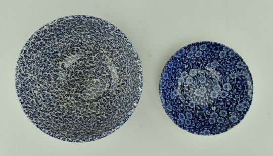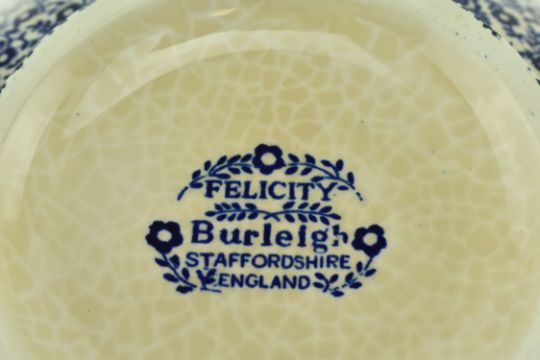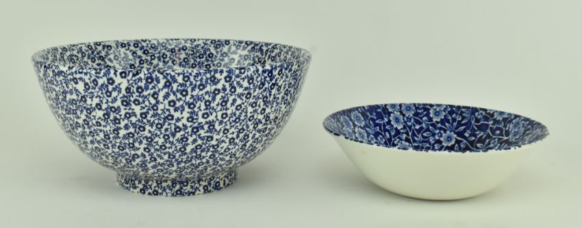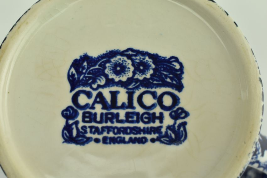 A selection of vintage 20th century blue and white patterned ceramic tablewares by Burleigh. Patterns include Calico, Felicity and Arden. The lot comprising water jug / ewer, soap dish, milk jug, bowls, cups and more. Makers marks to the bases of each. Tallest measures approx. 23cm x 18cm.