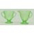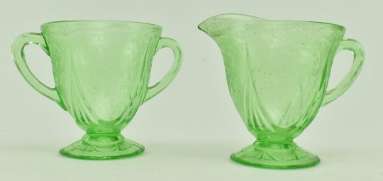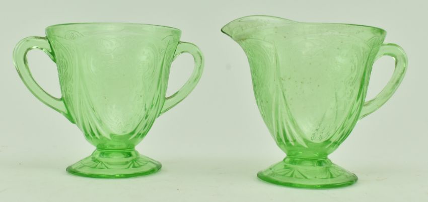 An early 20th century circa 1930s Depression era uranium pressed glass tea service, likely Hazel Atlas. Each piece with raised floral and foliate design. The lot comprising six teacups and six saucers, five side plates, a cream jug, twin handled sugar bowl and a larger cake plate. The cake platter measuring approx. 25cm in diameter, each teacup 6.5cm tall.