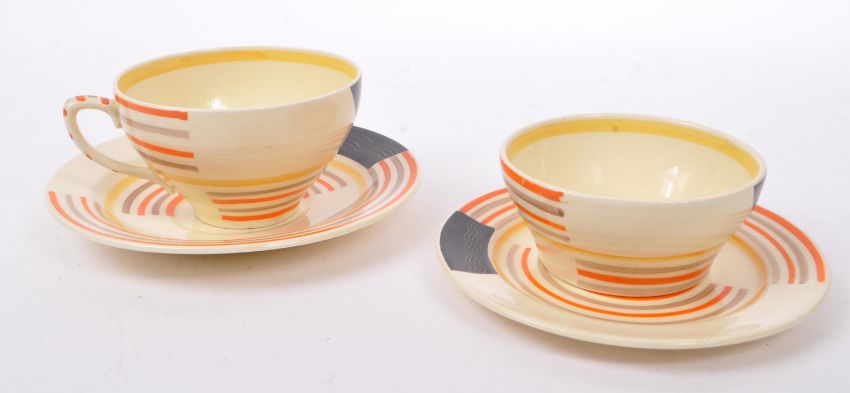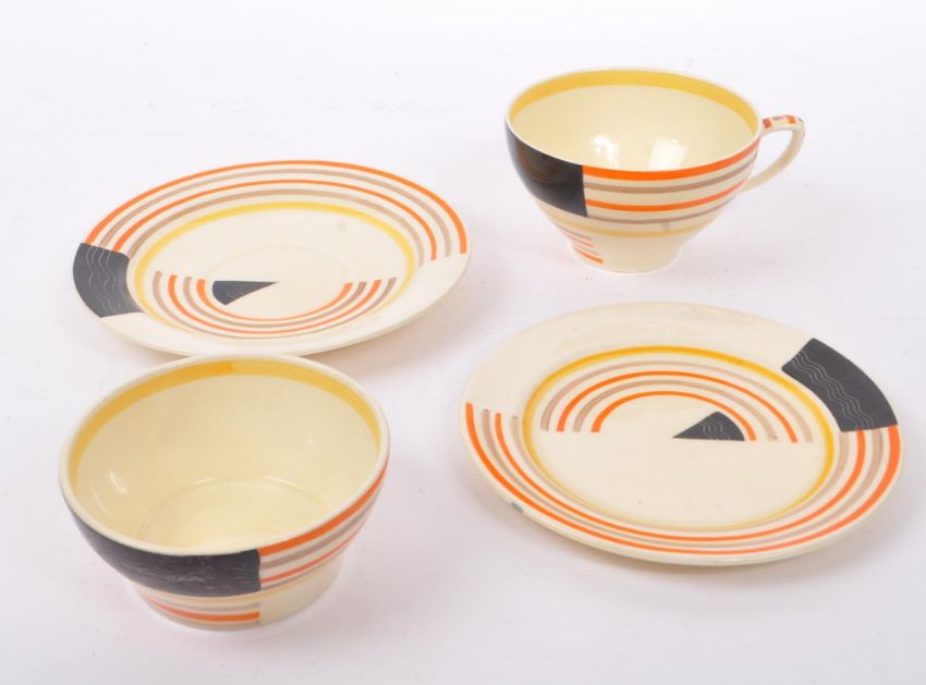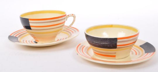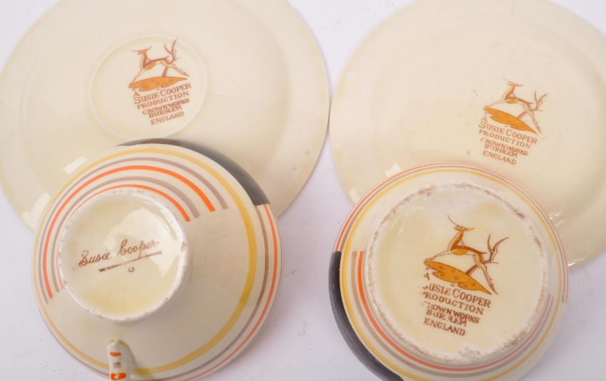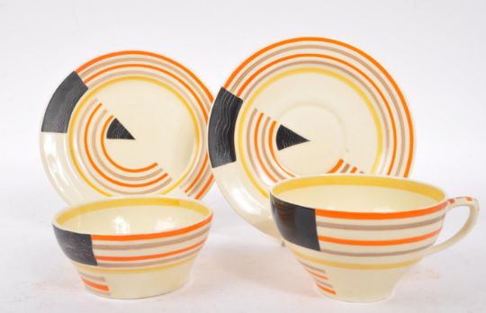 Susie Cooper - Crown Works Burslem - 1930s Art Deco china porcelain teacup and saucer with biscuit plate and sugar bowl. Having striking hand painted orange and black geometric design against cream ground. Makers mark to underside. Measures approx. 15cm diameter.