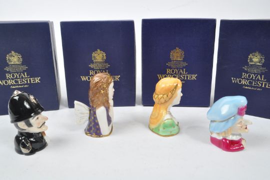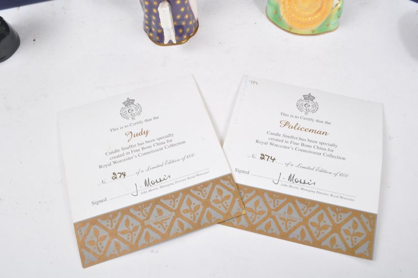 Royal Worcester - A collection of four china porcelain Royal Worcester Connoisseur Collection candle snuffers comprising of: Desdemona from Shakespeare's Characters; Titania from Shakespeare's Characters; Judy limited edition 274 / 600; and Policeman limited edition 274 / 600. All in original boxes, Judy and Policeman with certificates of authenticity. Measuring approximately 9cm tall.