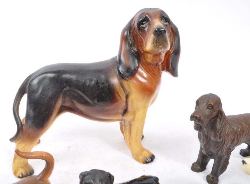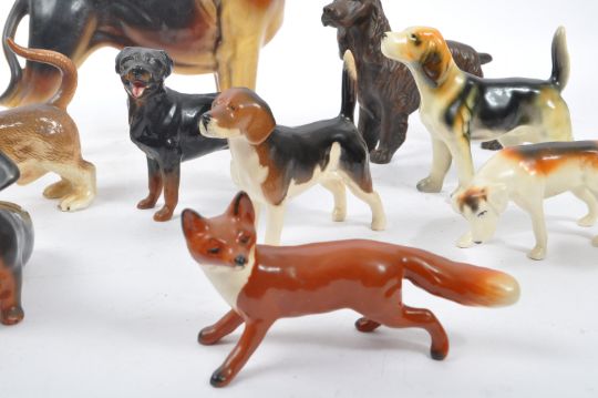 Beswick - A collection of 20th Century vintage china porcelain figurines in the form of dogs comprising of seven Beswick figures portraying various breeds such as beagle, daschund, rottweiler and bulldog as well as a fox. With other unstamped figures. Largest measuring approximately 19cm x 20cm.