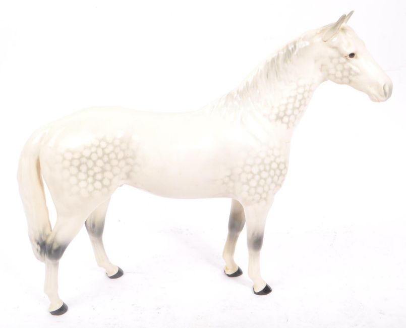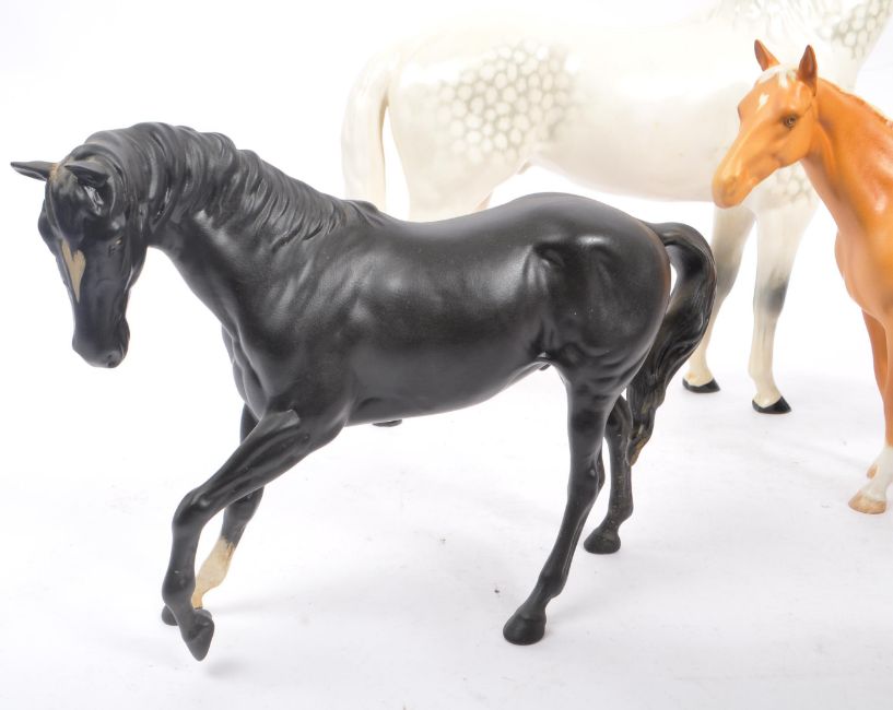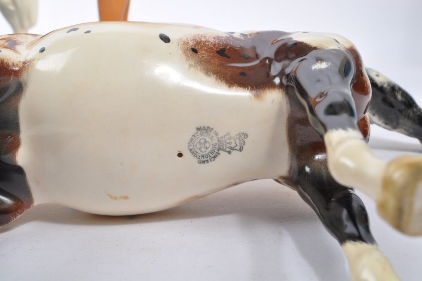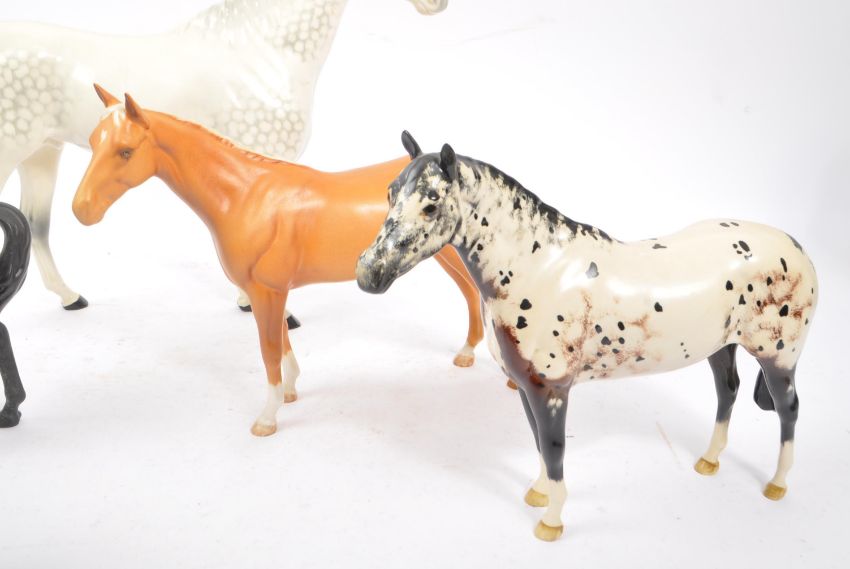 Beswick / Royal Doulton - A collection of five 20th Century vintage china porcelain figurines in the form of horses comprising of four Beswick of varying sizes and colours largest mottled white, all in different positions. Together with a Royal Doulton horse having white ground with black / brown spots. All figures stamped to base. Largest measuring approximately 30cm x 35cm.