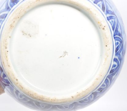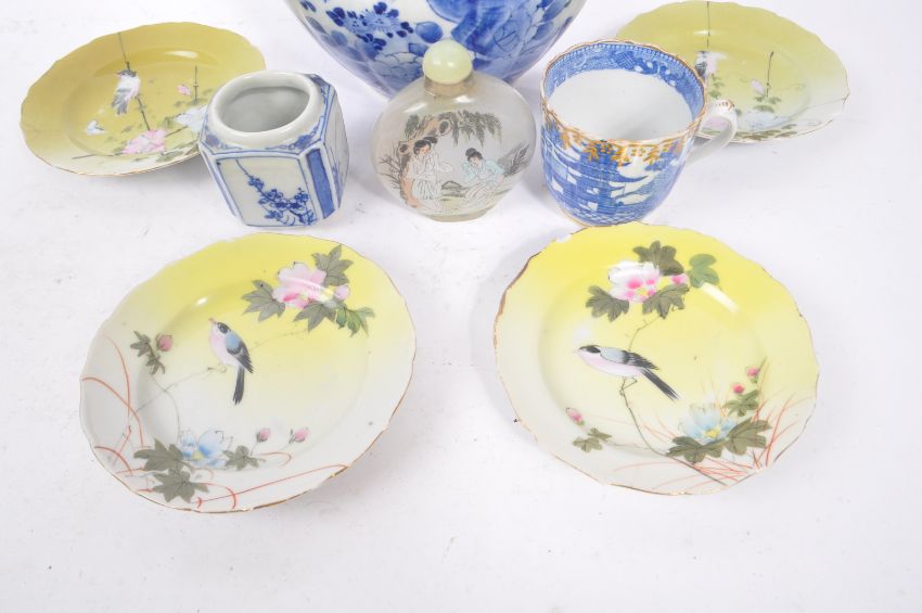 A collection of 19th and early 20th century Chinese and Japanese ceramics. The collection to include a set of four Meiji period saucers, alongside a Chinese blue and white planter, inkwell, and teacup with gilt detailing, and a 20th century Chinese perfume bottle.