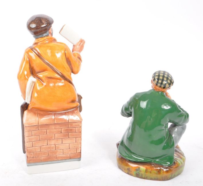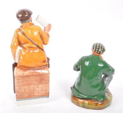 Royal Doulton - Two china porcelain Royal Doulton figurines comprising of The Newsvendor HN 2891 produced for the Newspaper Society to mark its 150th anniversary limited edition number 615 out of 2,500. Together with The Wayfarer HN 2362. Largest measuring approximately 21cm tall.