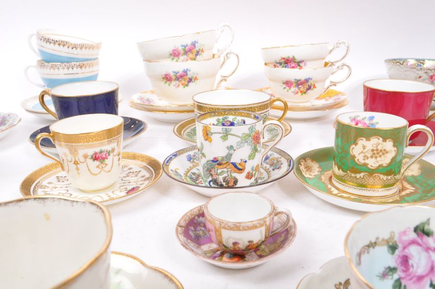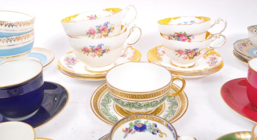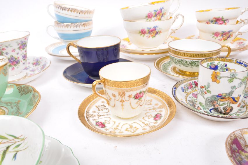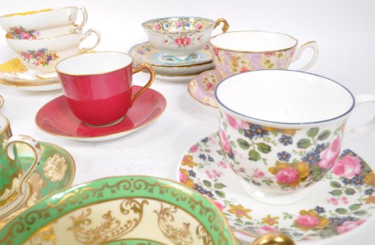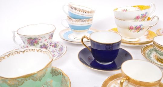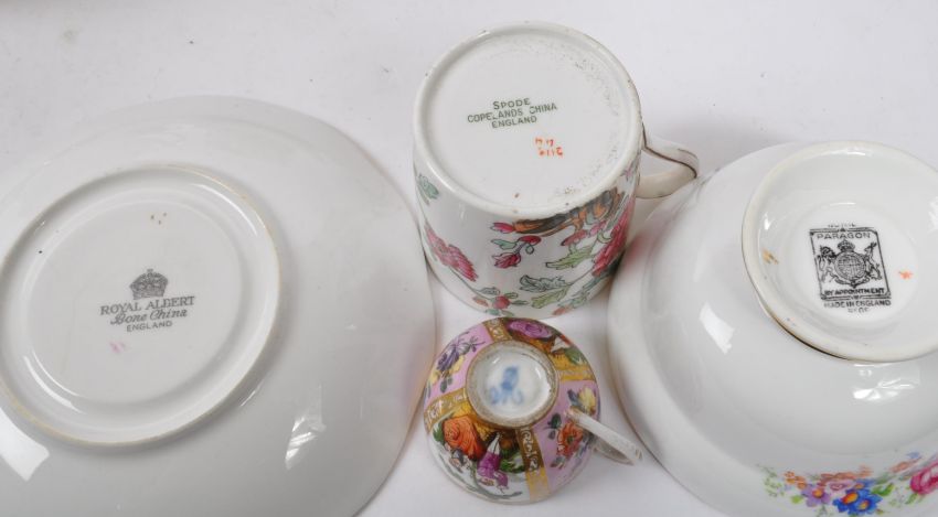 Royal Albert / Shelley / Paragon / Spode / Sadler - A large collection 20th Century vintage china porcelain cabinet teacups and saucers some examples include: Royal Albert - Tea Rose, Vintage Florals Lilac, Nell Gwynne Series Richmond; Paragon - Rockingham pattern yellow; Sadler - Olde Chintz; Crown Staffordshire - A13760 Green and gold pattern; Spode coffee cup and saucer; Shelley - Wild Flowers 13668; 18th Century Meissen miniature cup and saucer (AF); amongst other examples.