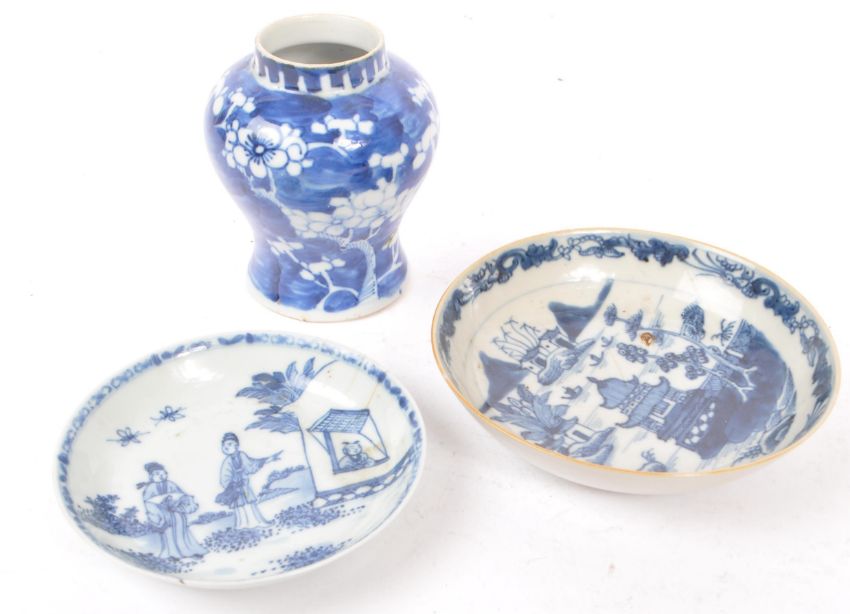 An early 20th century Chinese porcelain prunus vase. Together with a hand painted tea bowl and blue and white pin dish. With dual blue circles to underside. Measures approx. 11cm tall.