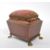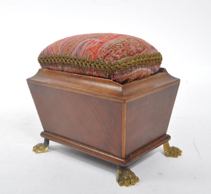 A George III early 19th century mahogany sewing companion / pin cushion. Sarcophagus form with drop in pin cushion to top, single small button drawer with lion's head ring pull handles. All raised on possible later claw feet. Measures approx. 15cm x 16cm x 12cm