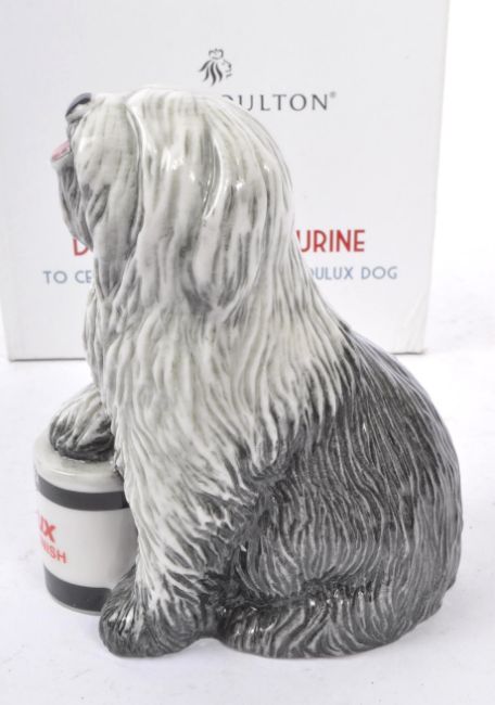 Royal Doulton - A china handmade Royal Doulton figurine in the form of a Dulux dog RDA144 celebrating 50 year anniversary of the Dulux dog produced only in the year 2011. The dog in sitting position with front paw resting on a Dulux Gloss Finish container. With original box and certificate of authentication. Dog measuring approximately 14cm tall.