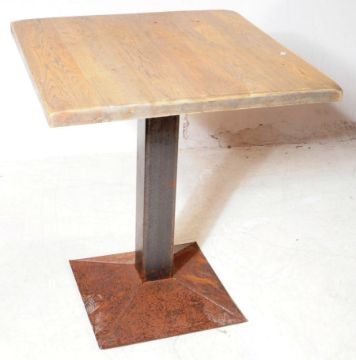 A set of four contemporary beer garden / pub bistro tables. Solid square elm top on a square metal base. Measures approx. 75x66x66cm