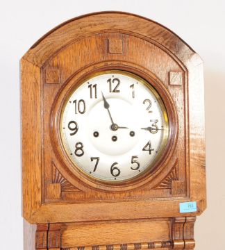 An Art Deco 20th century circa 1930s long case clock. Of oak construction with silver face and ebonised chapter ring. Glazed panel pendulum viewing front with wooden panel to lower. Raised on bracket feet. Measures approx. 180cm x 45cm x 22cm.