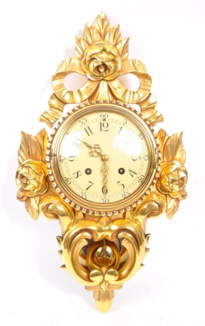 Westerstrand - A vintage 20th century Swedish gilt gesso wall hanging clock. Having an off white enamelled face with black Arabic numeral chapter ring. With eight day movement on a striking bell, rose flower motifs to side and top, with open display pendulum case. Measures approx. 53cm tall. Sold as untested key present. Westerstand incised to movement.