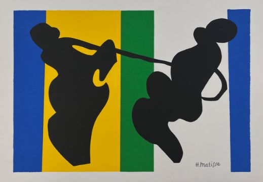 An assortment of seven vintage lithographs on paper after Henri Matisse (1869-1954). The lot to include a lithograph after ' L'Avaleur de Sabres ', a lithograph after ' Le Cowboy ', a lithograph after ' Le peintre et son modèle ', two lithographs of lady posing on black ground, together with two blue nudes lithographs. All unframed. Each measures approx. 45cm X 58cm  (18" x 23").