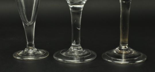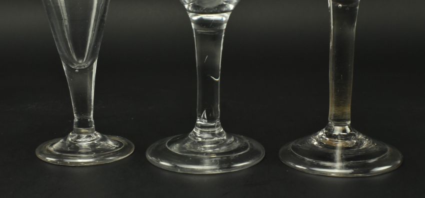 An assortment of three George II 18th century English hand blown plain stem wine drinking glasses. The lot to include two examples with ogee bowl, plain stem raised on circular foot; together with a conical bowl, plain stem on circular foot glass. Largest measures approx. 15cm tall x 6.5cm in diameter.