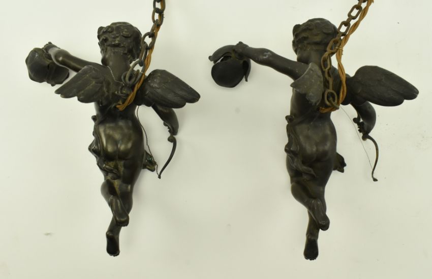 A pair of French Continental early 20th century c1900 bronze cherubs wall sconces lights. Each sconce in the shaped of winged cherubs with arrow in one hand and holding light fitting in the other. Sold as untested. Each measures approx. 23cm x 18cm x 15cm.