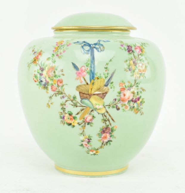 Coalport - A 19th century hand painted fine bone china porcelain lidded vase. The vase of squatted baluster shape with circular lid. Pale mint green ground with front gilt framed vignette depicting an intricate game bird still life. At the back, a woven basket with ribbon & hat framed by swags of roses & floral garlands. Makers mark to base. Measures approx. 11cm tall, 11cm in diameter.