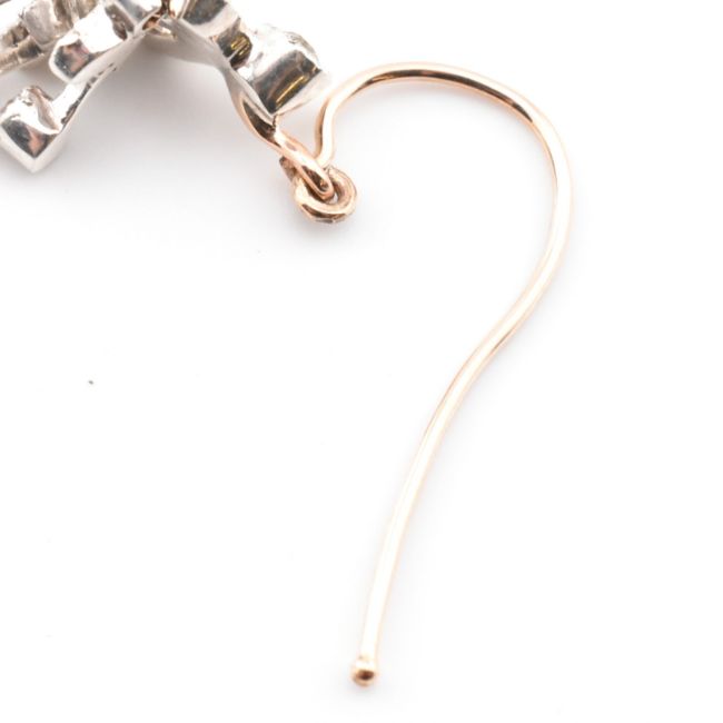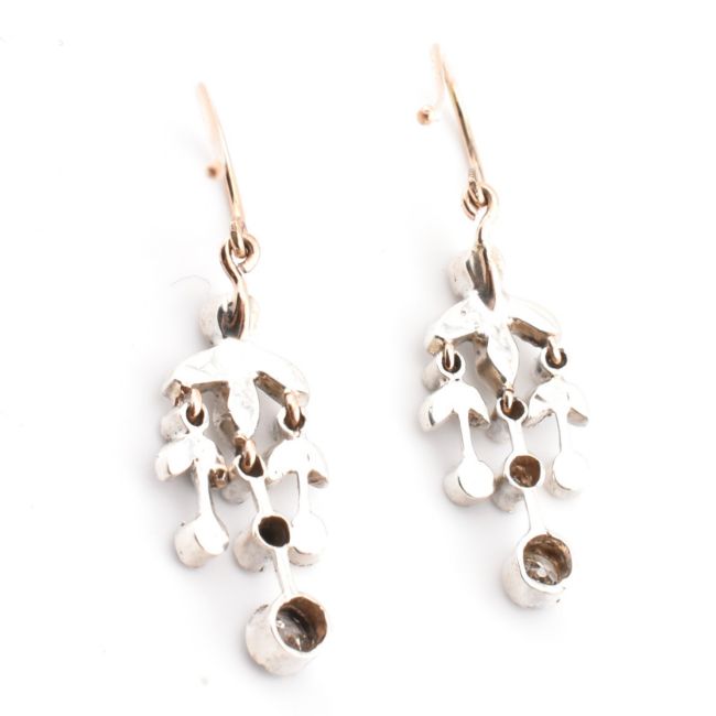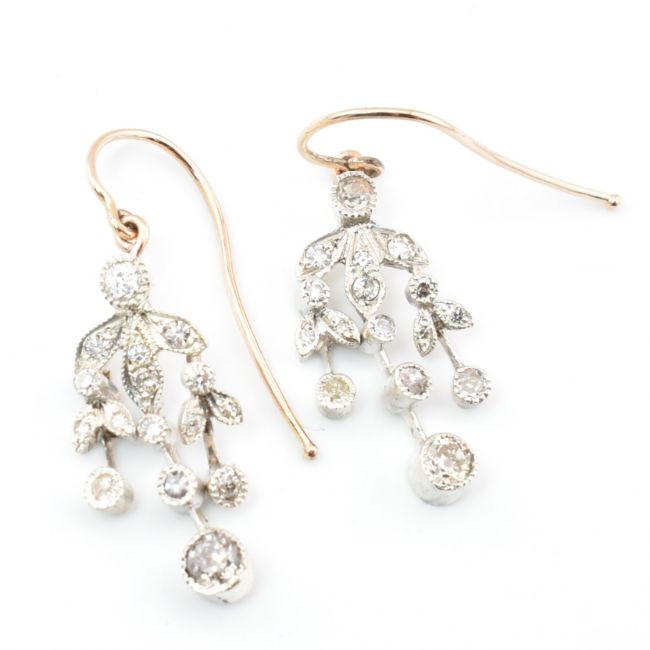 A pair of Edwardian diamond pendant earrings. The earrings strung with bezel set old cut diamonds suspended from foliates style mounts to fish hook fasteners. Unmarked tests indicate gold. Weight 4g. Measures drop 3cm. All weights, measurements and sizes are approximate.