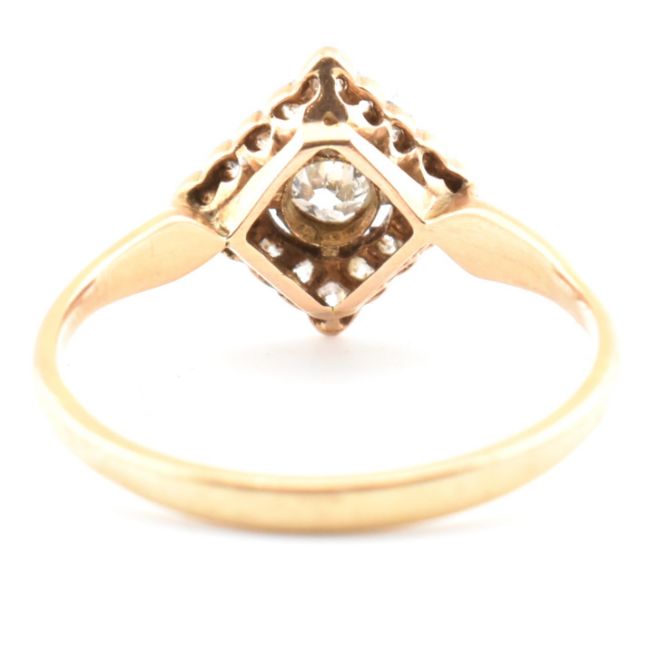 A gold and diamond Art Deco lozenge ring. The Art Deco yellow gold ring having a central bezel set round cut diamond surrounded by sixteen round cut diamonds set in a white gold lozenge shaped mount to tapered yellow gold shank. Unmarked however surface tests indicate 18ct gold. Estimated total diamond weight 0.30cts. Size P.5. Weighs 2.4g. All weights, measurements and sizes are approximate.