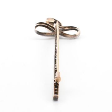 A Edwardian gold, platinum diamond and pearl brooch pin. The pin in ribbon design set with 69 old cut diamonds surmounted by a single pearl. Unmarked tests indicate gold & platinum. Weight 9.5g. Measures 10.5cm. All weights, measurements and sizes are approximate.